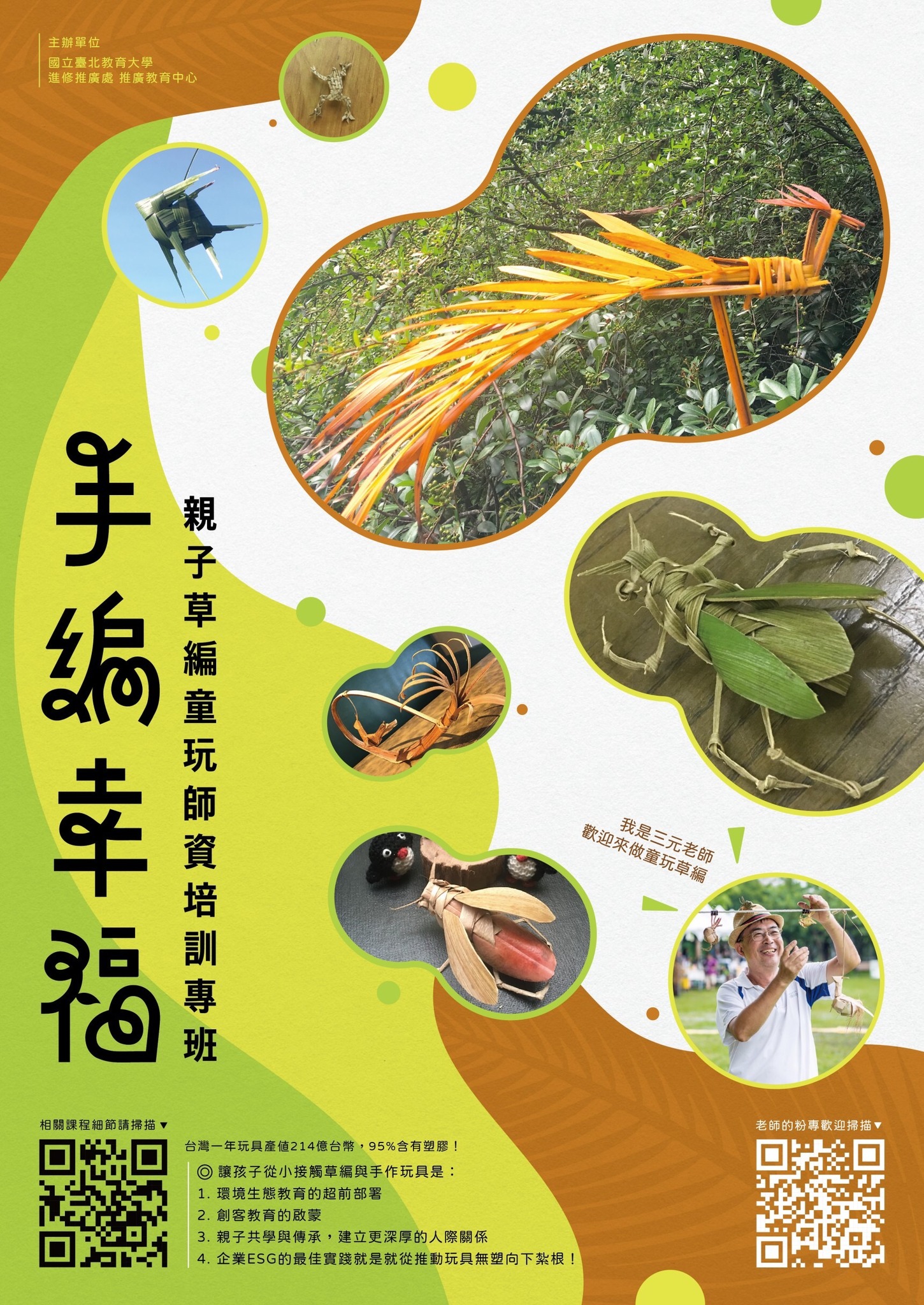 一、 草編幸福-童玩技藝師資培訓:112年4月8日週六9:00-16:00共6小時,全勤並通過評核將核發研習證明書。課程特聘專業草編達人「草編CEO林三元老師」親授,包含戶外採集、戶外與教室型態的教學示範、草編文化歷史理論介紹,豐富多樣的內容不藏私分享,歡迎18歲以上對草編童玩有興趣之教師或一般民眾報名。