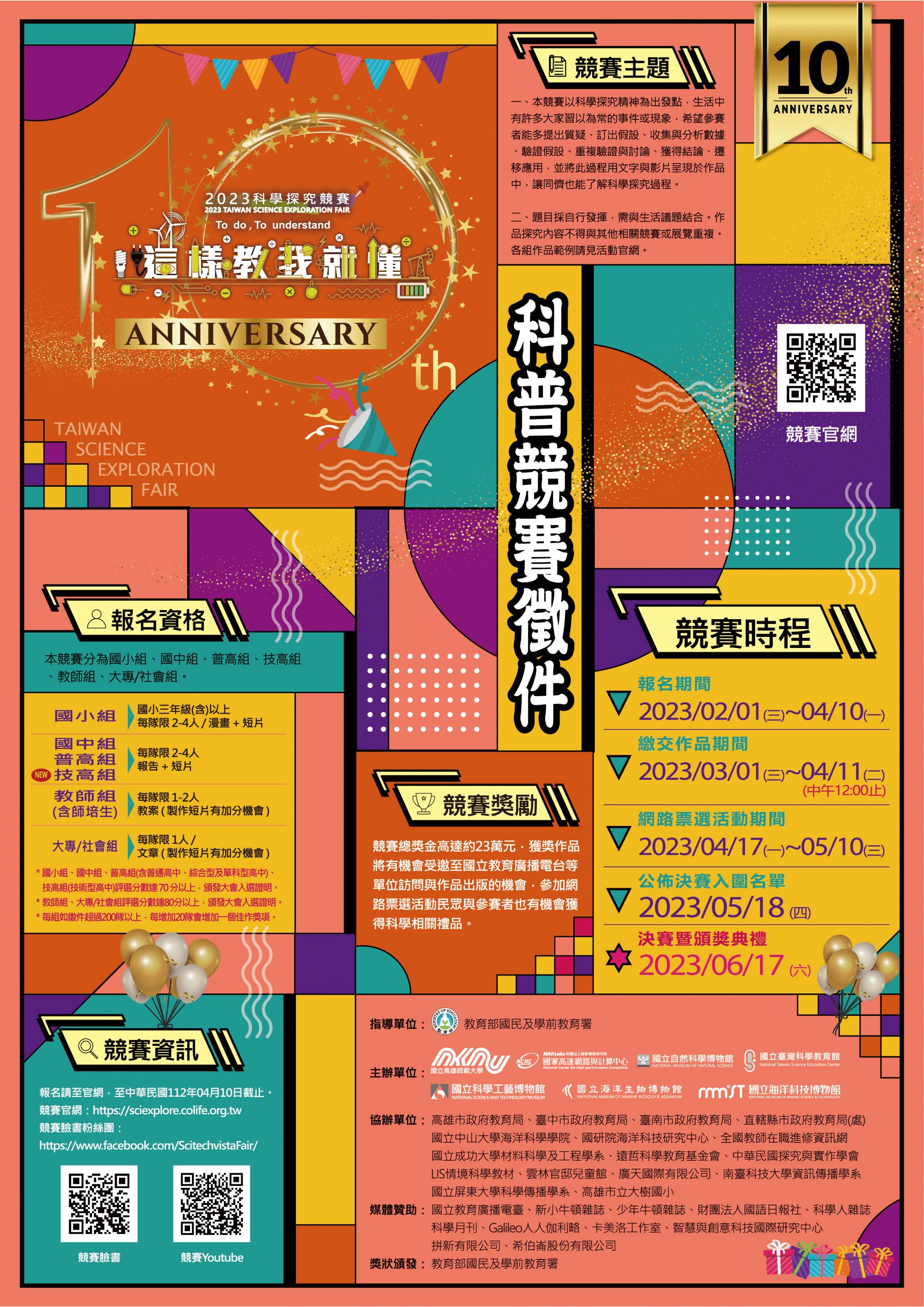 三、 旨揭競賽分為小學、國中、普高、技高、教師、大專社會組,每年計有上千隊來自海內、外選手參加。競賽詳情請參考官網說明(http://sciexplore.colife.org.tw/),如有疑問,請逕洽承辦人施柏亨(電話:0988-415777)。